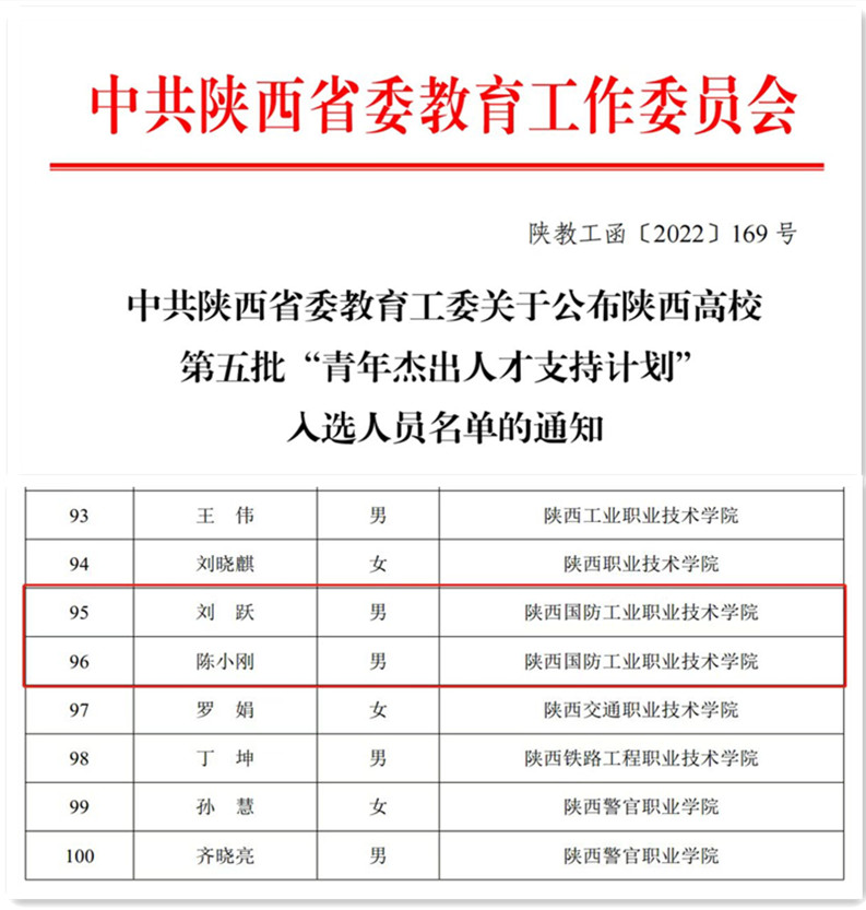日前,中共陕西省委教育工委公布了陕西高校第五批“青年杰出人才支持计划”入选人员名单,我校智能制造学院刘跃博士、马克思主义学院陈小刚副教授入选。此次我校入选人数位列陕西高职院校前列,取得了历史上最好成绩,全省高职院校本次共有8人入选。截至目前,我校共有5人入选“青年杰出人才支持计划”。