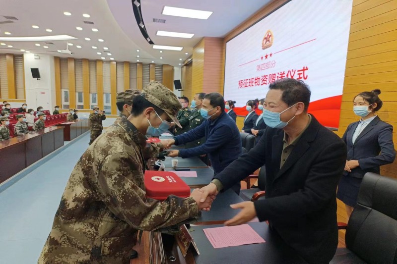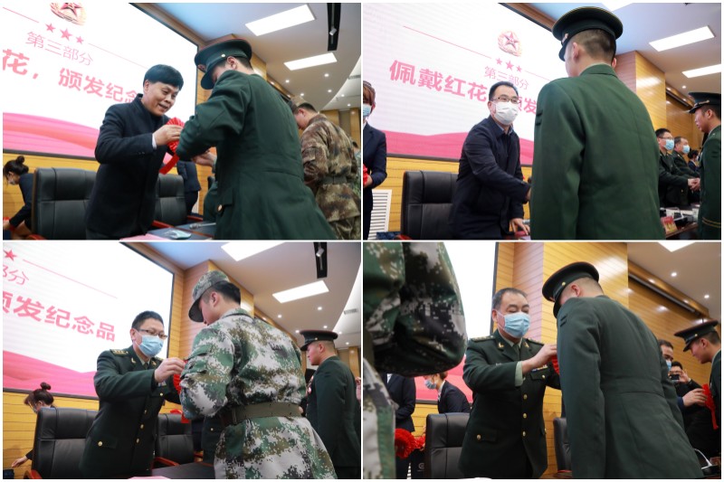 会后,与会领导为我校退役复学大学生佩戴光荣花、颁发纪念品,余下街道办事处为我校预征班赠送物资,与会领导与退役复学大学生合影留念。