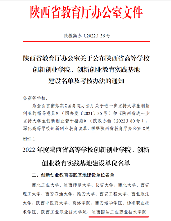 近日,陕西省教育厅下发了《关于公布陕西省高等学校创新创业学院、创新创业教育实践基地建设名单及考核办法的通知》(陕教高办〔2022〕36号),我校成功获批首批省级创新创业教育实践基地建设单位。