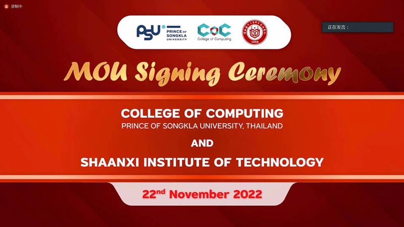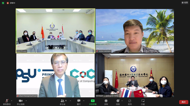 为拓宽我校学生学历晋升渠道,经过前期多次沟通,11月22日下午,我校与泰国宋卡王子大学合作备忘录签约仪式通过视频连线的方式在线举行。宋卡王子大学副校长Pun Thongchumnum博士、计算机与软件学院院长Aziz Nathaamornphong博士、孔子学院中方院长杨文波、普吉国际艺术交流中心董事长田班超在泰国参加了签约仪式。我校孟繁增副校长、国际交流处、计算机与软件学院负责人在教师沙龙会议室参加会议。