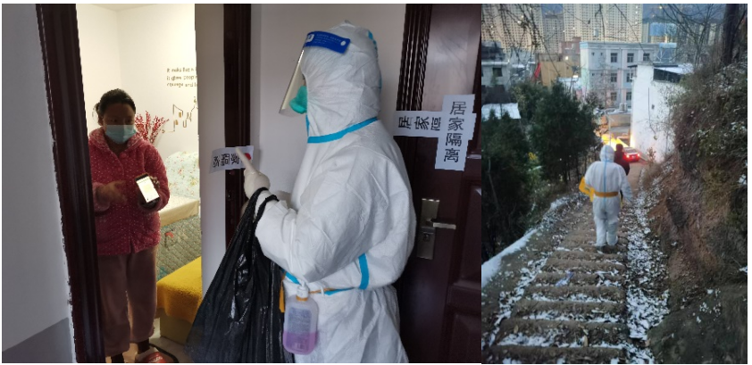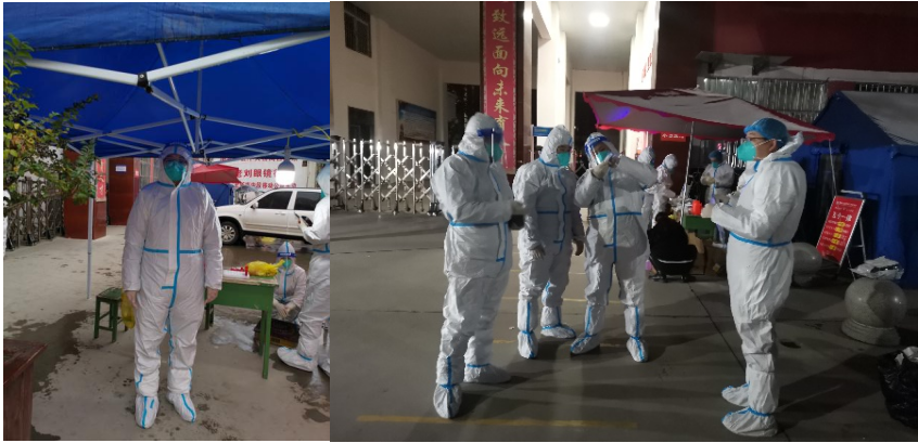 到达防疫点以后,各位帮扶老师换好防护服,便开始了紧张的扫码检测工作。有的在核酸检测点扫码一站就是3个多小时,有的跟随医生为居家隔离人员和行动不便的老人上门检测,他们不辞辛苦,不畏艰难,7点零星的雪片伴着小雨,带着隔离面罩,雨雪模糊了他们的视线,台阶变得湿滑,他们仍坚持着没有退缩。做完检测工作,都已经十点多了,他们雨雪浸湿裤脚,饥寒交加,但他们没人叫苦喊累,以一名新时代职教人的标准严格要求自己,尽自己最大的努力做好山阳的疫情防控工作,为疫情防控做出自己的努力。