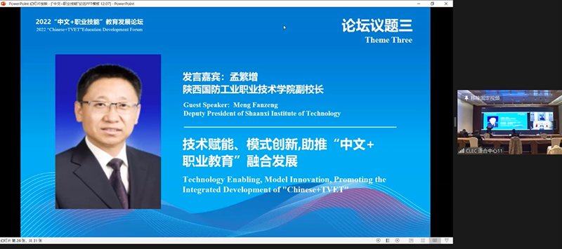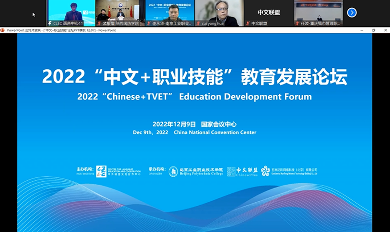 12月9日下午,由教育部中外语言合作交流中心主办、北京工业职业技术学院与中文联盟联合承办的“中文+职业技能”教育发展论坛如期举行。我校孟繁增副校长应邀参加,他结合我校国际化办学实际,围绕“中文+职业教育”如何提升中国教育国际影响力、如何助力企业“走出去”以及我校“中文+职业教育”海外培训基地和未来展望四个方面做了题为“技术赋能、模式创新,助推“中文+职业教育”融合发展”的主题分享。作为大会的多场平行论坛之一,该论坛重点聚焦于推动“中文+职业技能”教育更好的服务共建“一带一路”高质量发展、“中文+职业技能”教育支撑体系建设、职业院校及企业协同助力“中文+职业技能”教育海外推广等三个议题。中外语言合作交流中心主任马箭飞、中国--东盟中心秘书长史忠俊出席会议并致辞,泰国教育部职业教育委员会秘书长、塔吉克斯坦教育和科学部高等专业和研究生教育司司长、老挝驻华使馆教育文化参赞以及北京工业职业技术学院、中文联盟、中国有色矿业集团有限公司等8所高校、4家企业受邀参加。在中文联盟王锦红主席的分享中,她多次引用我校联合中文联盟搭建的“中文+职业教育”网络课程平台、举办的中国双高院校海外宣讲培训会和“中文+职业技能”教育在线培训等成果为例,探讨职业院校及企业如何协同助力“中文+职业技能”教育海外推广。