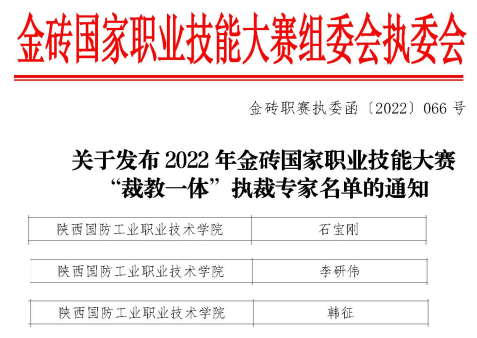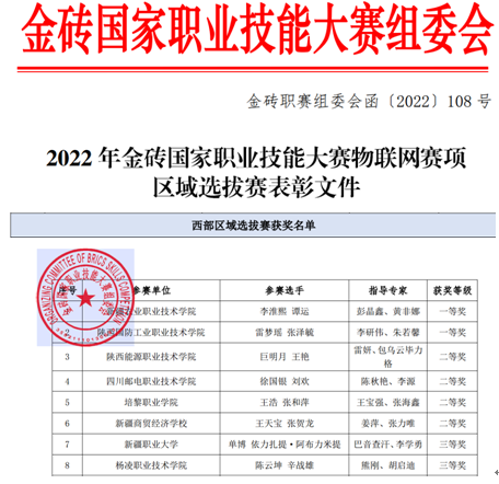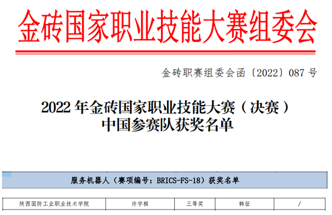 近日,金砖国家职业技能大赛组委会发布了系列竞赛表彰奖励文件,《关于2022年金砖国家职业技能大赛为国际级竞赛的说明》金砖职赛组委会涵[2022]110号、《关于发布2022年金砖国家职业技能大赛执裁专家名单的通知》金砖职赛执委涵[2022]066号、《2022年金砖国家职业技能大赛(决赛)中国参赛队获奖名单》金砖职赛组委会函[2022] 087号、《2022金砖国家职业技能大赛物联网赛项区域选拔赛表彰文件》金砖职赛组委会函[2022]108号、《2022年金砖国家职业技能大赛(决赛)专家组名单》金砖职赛执委涵[2022]034号等文件的通知,我校人工智能学院韩征、李研伟、石宝刚三位教师分别为国赛裁判,韩征老师指导学生获得服务机器人赛项区域选拔赛二等奖、国赛三等奖,李研伟、朱若馨老师指导学生获得物联网赛项西部区域选拔赛一等奖。