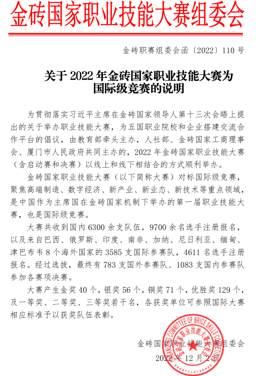 为贯彻落实习近平主席在金砖国家领导人第十三次会晤上提出的关于举办职业技能大赛,为五国职业院校和企业搭建交流合作平台的倡议,由教育部牵头主办,人社部、金砖国家工商理事会、厦门市人民政府共同主办首届金砖国家职业技能大赛,对标国际级竞赛,聚焦高端制造、数字经济、新产业、新业态、新技术等重点领域,是中国作为主席国在金砖国家机制下举办的第一届职业技能大赛,也是国际级竞赛。