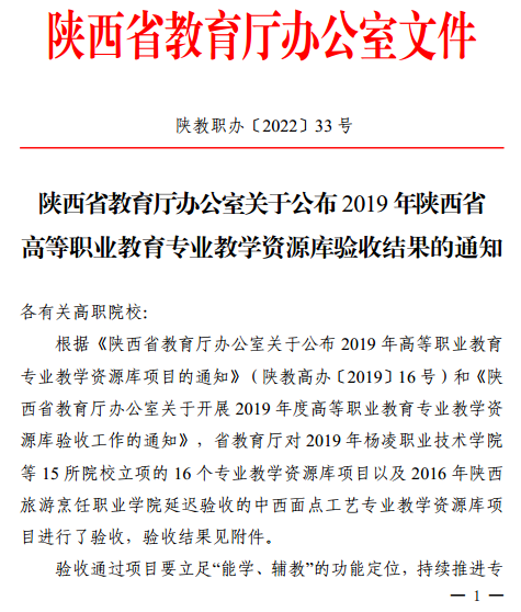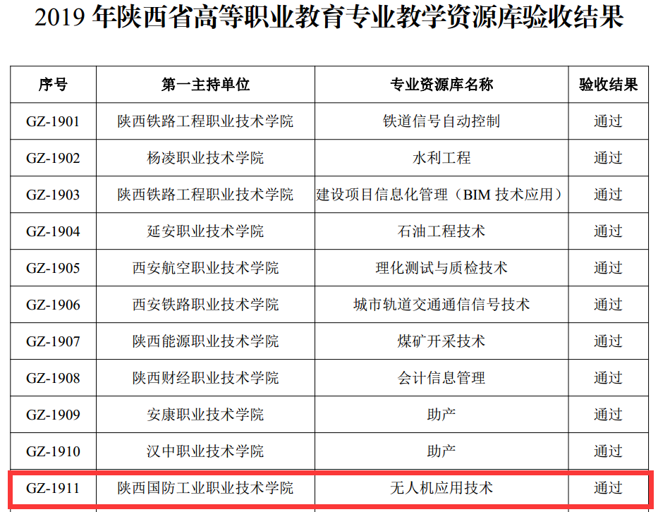 陕西省教育厅办公室关于公布 2019 年陕西省高等职业教育专业教学资源库验收结果的通知,省教育厅对2019年15所院校立项的 16 个专业教学资源库项目以及延迟验收专业教学资源库项目进行了验收,我校主持的无人机应用技术专业教学资源库顺利通过验收。