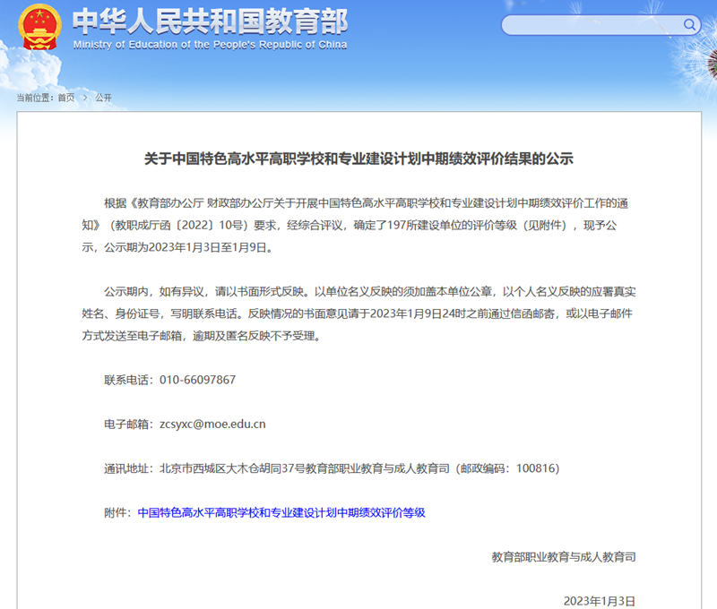 1月3日,教育部发布了《关于中国特色高水平高职学校和专业建设计划中期绩效评价结果的公示》,我校获评国家“双高计划”中期绩效评价“优秀”等次。