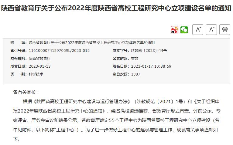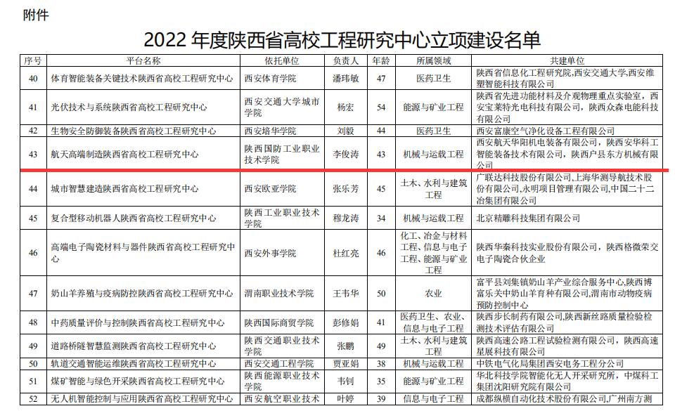 根据《陕西省教育厅关于公布2022年度陕西省高校工程研究中心立项建设名单的通知》(陕教函〔2023〕44号),我校航天高端制造陕西省高校工程研究中心获批立项建设,这是我校第一个省级科研平台。航天高端制造陕西省高校工程研究中心由我校牵头,联合西安航天华阳机电装备有限公司、陕西安华科工智能装备技术有限公司、陕西户县东方机械有限公司共同建设。航天高端制造陕西省高校工程研究中心立足关中先进制造业,服务国家航天装备制造业智能化升级发展,积累自主知识产权,实现技术攻关和科技成果转化。