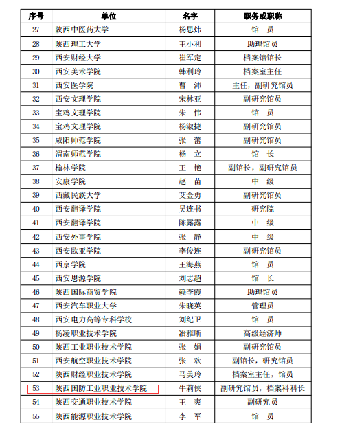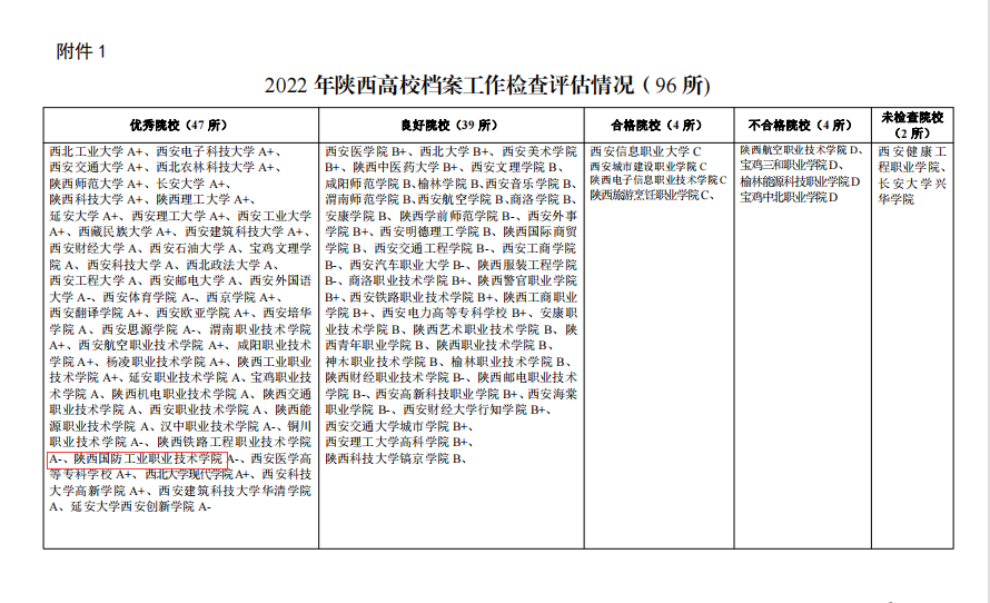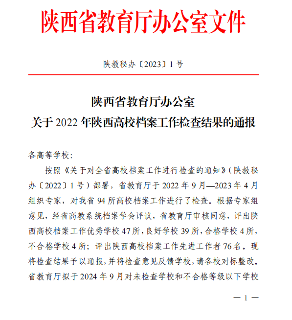 6月26日,陕西省教育厅印发《陕西省教育厅办公室关于2022 年陕西高校档案工作检查结果的通报》(陕教秘办〔2023〕1号),全省高校档案检查工作每五年开展一次,本次检查评出陕西高校档案工作优秀学校47所,良好学校39所,合格学校4所,不合格学校4所;评出陕西高校档案工作先进工作者76名。我校在全省94所高校中脱颖而出,荣获“优秀”等次,牛莉侠荣获陕西高校档案工作先进工作者荣誉称号。