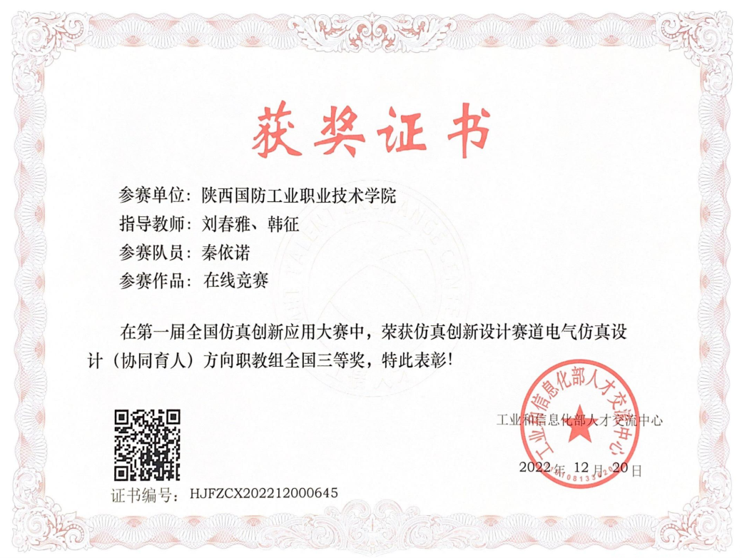 由工业和信息化部人才交流中心主办的全国电气虚拟仿真设计大赛中,我校人工智能学院老师刘春雅、韩征指导学生秦依诺参赛,经过省赛选拔赛、国赛竞赛的激烈角逐,我校代表队凭借扎实的专业知识、出色的表现和技术创新,荣获国赛三等奖,此次荣誉证明了我校在电气工程领域的技术实力和创新能力。