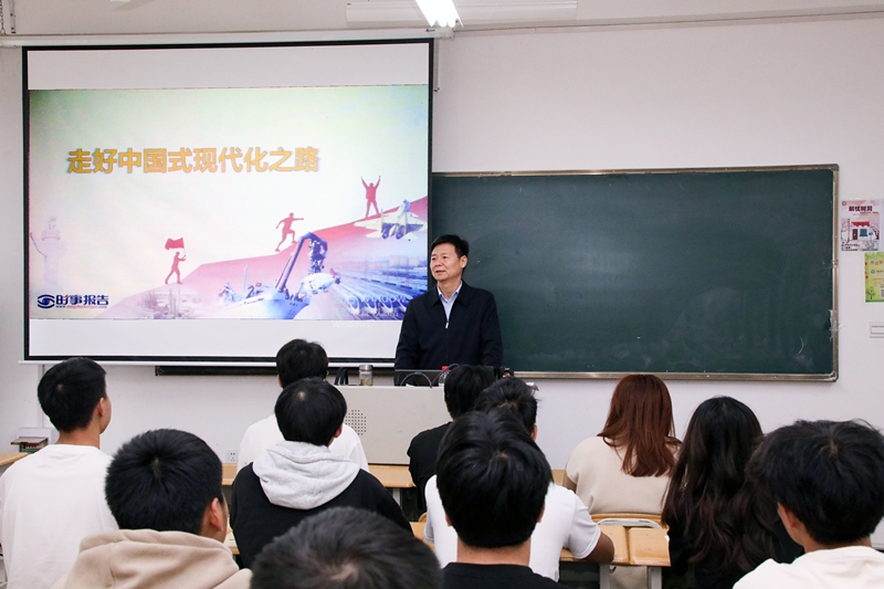 副校长孟繁增,以“立志复兴伟业,踔厉奋发前行”“走好中国式现代化之路”“在新时代新征程上推进祖国统一”“脆弱复苏的世界经济”为题为汽车工程学院(新汽3224班)学生讲授形势与政策课。