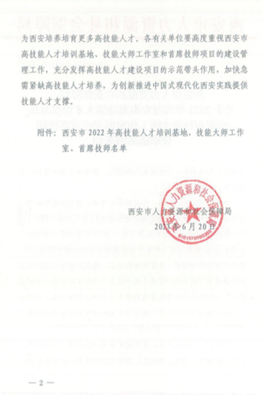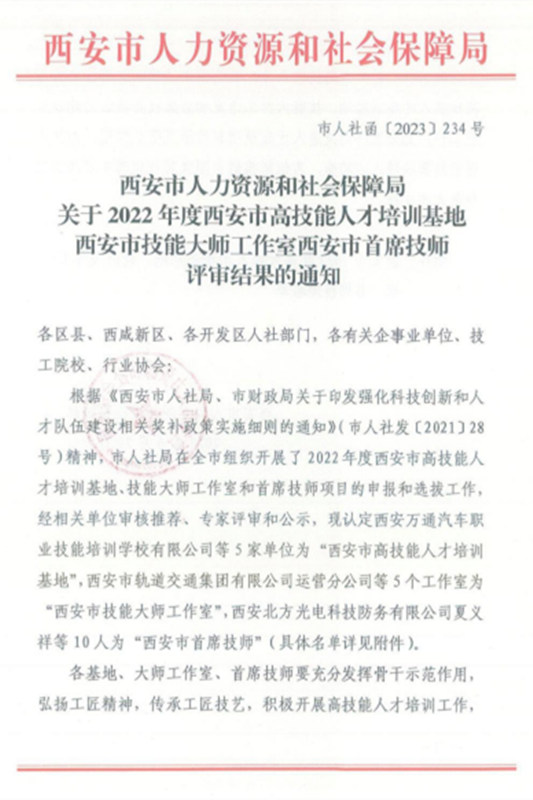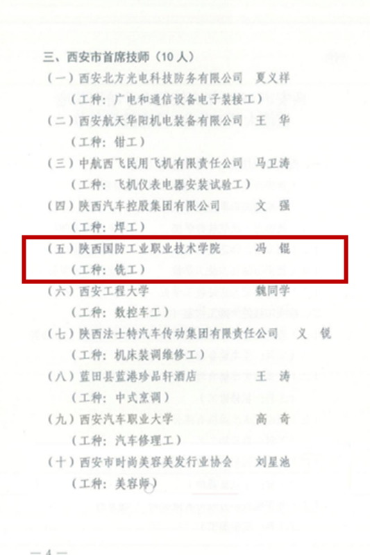 近日,西安市人力资源和社会保障局印发了《西安市人力资源和社会保障局关于2022年度西安市高技能人才培训基地 西安市技能大师工作室 西安市首席技师评审结果的通知》(市人社函〔2023〕234号),我校教师冯锟荣获“西安市首席技师”荣誉称号。