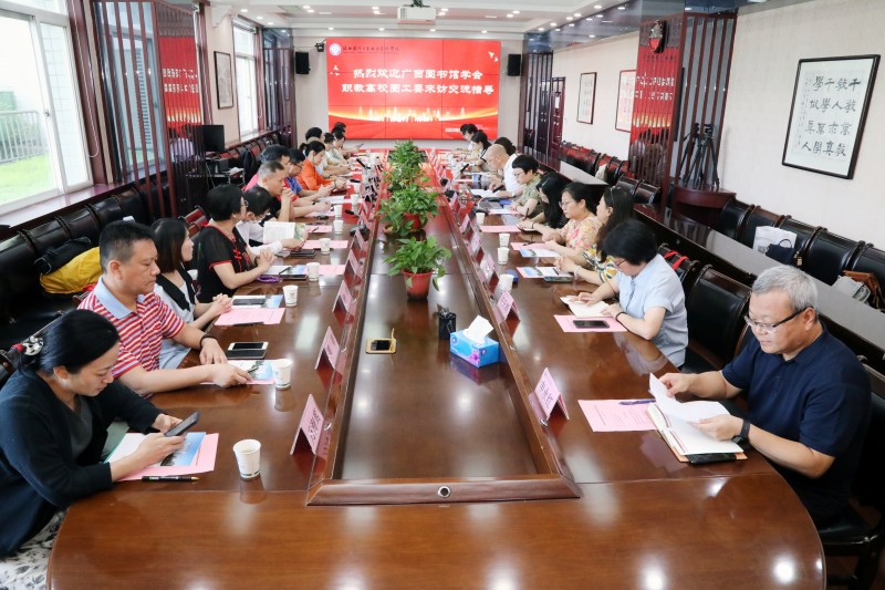 2023年7月7日,广西图书馆学会职教高校工作委员会主任委员黄慧一行26人来我校交流调研。我校副校长刘少阳及图书馆相关负责人出席座谈会,会议由图书馆馆长闫晓前主持。
