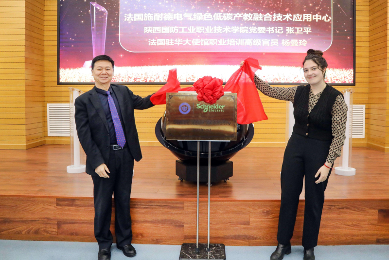 党委书记张卫平与法国驻华大使馆杨曼玲女士共同为法国施耐德电气绿色低碳产教融合技术应用中心揭牌。