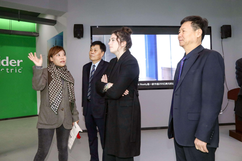 随后,一行参观了法国施耐德电气绿色低碳产教融合技术应用中心,参观过程中,党委书记张卫平表示:该项目作为学校的重点建设任务,在整个建设过程中不断优化和完善实施方案,从场景布置、文化设计、设备装调等很多细节上反复推敲,希望今后在育人、科研、社会服务、技能提升和国际交流等领域起到引领和示范的作用。