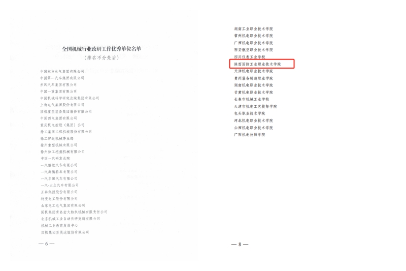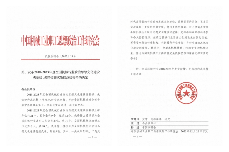 2023年12月22日,中国机械工业职工思想政治工作研究会印发《关于发布2018-2023年度全国机械行业政治思想文化建设献榜、先锋榜和成果榜总榜榜单的决定》(〔2023〕18号)。betway必威中文正版荣获全国机械行业政研工作优秀单位称号,学校报送的创新成果《军工高职院校红色文化育人模式实践研究》《弘扬科学家精神,建设“大思政课”》分别入选全国机械行业政治思想文化建设创新成果二类成果和三类成果,党委宣传部陈小刚同志获评全国机械行业政研工作优秀个人称号。这是我校近年来首次获得全国机械行业政研工作优秀单位称号。