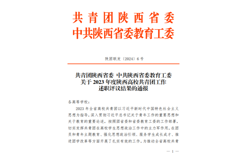 3月11日,共青团陕西省委、中共陕西省委教育工委下发了《关于2023年度陕西高校共青团述职评议结果的通报》文件,我校荣获“2023年度陕西高校共青团工作优秀单位”,党委副书记杨聪获得“2023年度陕西高校支持共青团工作好书记(校长)”称号,团委书记张钊荣获“2023年度陕西高校共青团工作先进个人”荣誉称号。