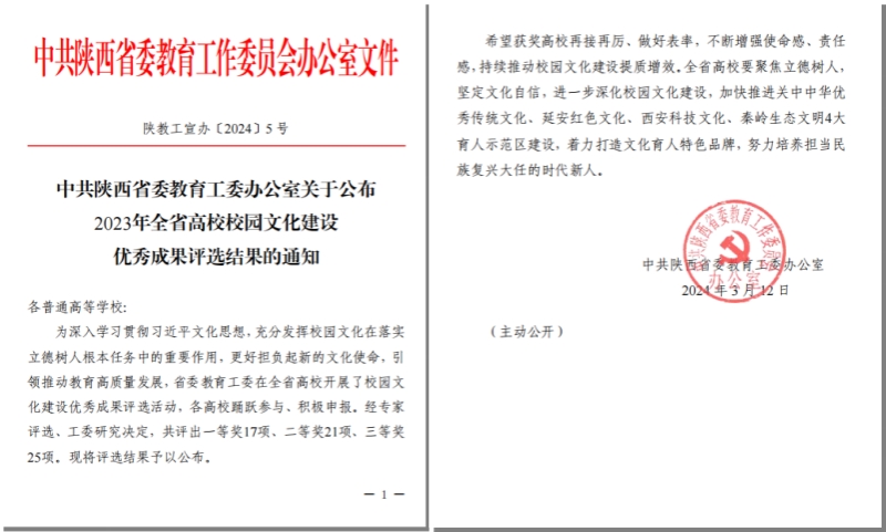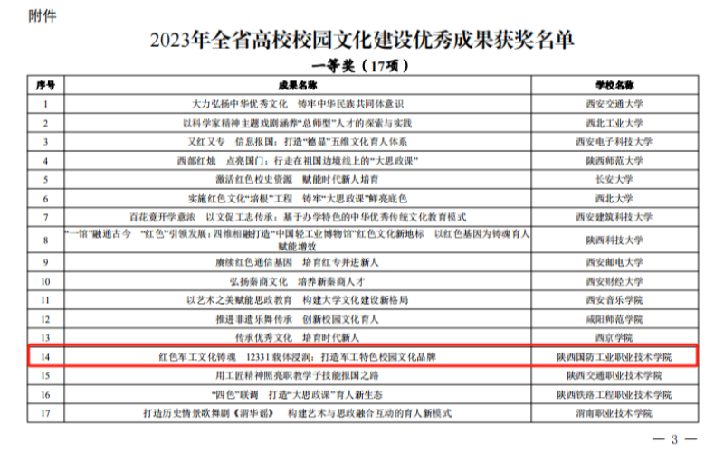 2024年3月12日,陕西省委教育工委公布了2023年全省高校校园文化建设优秀成果评选结果,共评选一等奖17项、二等奖21项、三等奖25项。我校报送的成果作品《红色军工文化铸魂12331载体浸润:打造军工特色校园文化品牌》荣获一等奖。学校已连续两年荣获陕西省高校校园文化建设优秀成果一等奖。