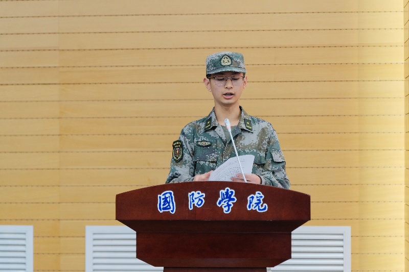 接下来2023级预征班学员惠得意上台发言,他代表2023级预征班全体学员表示:“我们将以军人的标准严格要求自己,认真学习、刻苦训练,努力实现自己的从军梦想”。最后由预征班副连长刘琪带领全体预征班学员庄严宣誓:积极参加国防事业建设,忠实履行学员义务,刻苦训练,努力学习。
