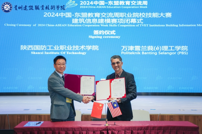 8月20日至25日,2024年中国-东盟教育交流周在贵阳举办。8月22日,我校副校长孟繁增与马来西亚万津雪莪理工学院校长Ibrahim Bin Burhan在贵州装备制造职业技术学院签署合作框架协议并交换礼物。