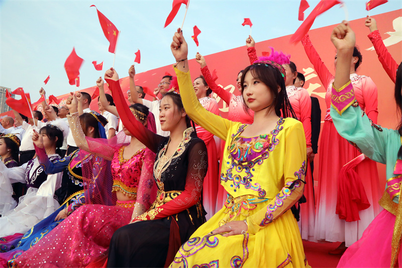 活动最后,现场1500余名师生共同唱响《歌唱祖国》,师生深情地挥舞着国旗,现场连成一片红色的海洋,强烈的爱国情感在师生心中流淌,五星红旗与灿烂笑容在这里绽放,奋斗与梦想在这里汇聚,饱含着爱国深情的熟悉旋律回荡在广场上空,令人久久难忘。