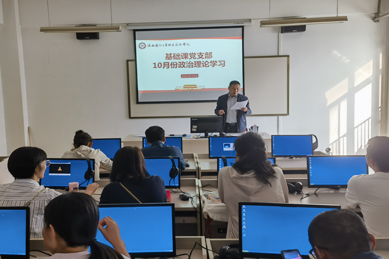 【基础课党总支】根据陕国职党宣〔2024〕17号文件《关于2024年10月教职工政治理论学习暨组织活动安排的通知》相关要求,为进一步加强基础教职工的政治理论学习,切实提高教职工政治素质和理论水平,基础课党总支于2024年10月16日在北区5-607语音室开展10月教职工政治理论学习,会议由党总支书记权华主持。