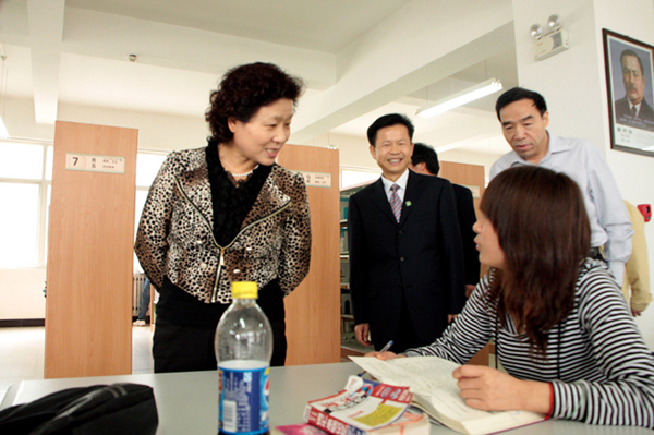 在我院党委书记张文斌、院长张权民等领导的陪同下,朱静芝副省长观看了我院发展规划沙盘和校史展、考察了我院图书馆、实验实训基地、教学楼、学生公寓、学生食堂、大学生活动中心等,并与我院教师和学生亲切交谈。