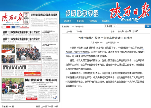 陕西日报头版显著位置报道“大国工匠”徐立平来我校