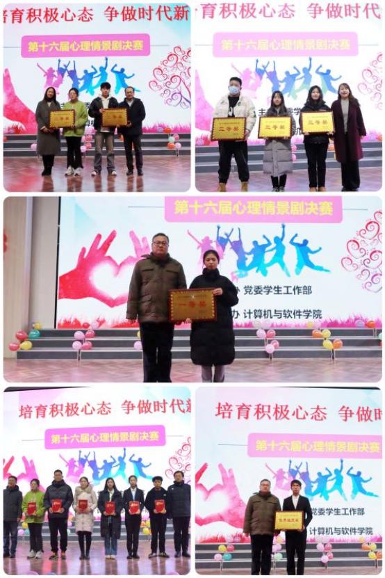 大赛历经初赛、复赛、决赛阶段,各学院高度重视,精心组织。比赛现场,各位参演者全情投入尽情展示,出彩的表演、有趣的台词、丰富的剧情无不吸引着全场观众的目光,呈现了一场精彩绝伦的比赛。经过激烈角逐,计算机与软件学院《用爱搭建心灵的桥梁》获得一等奖,智能制造学院《虚荣心》、电子信息学院《小丑》获得二等奖,艺术与设计学院《致郁-治愈》、化学工程学院《告别拖延,积极人生》、汽车工程学院《暗遇光》获得三等奖。计算机与软件学院获得优秀组织奖,耿丹凤、张明、李徐辉、杨永春、张晗、任军峰获得优秀指导老师。