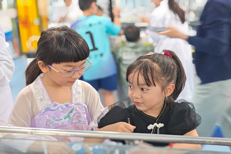 在科普实验模块,科普老师在分析室为同学们表演了“魔壶”“变色的碘伏”等有趣的科普实验,并讲解了其中的化学原理。大小朋友们对神奇的化学现象惊叹不已,并亲手实践。