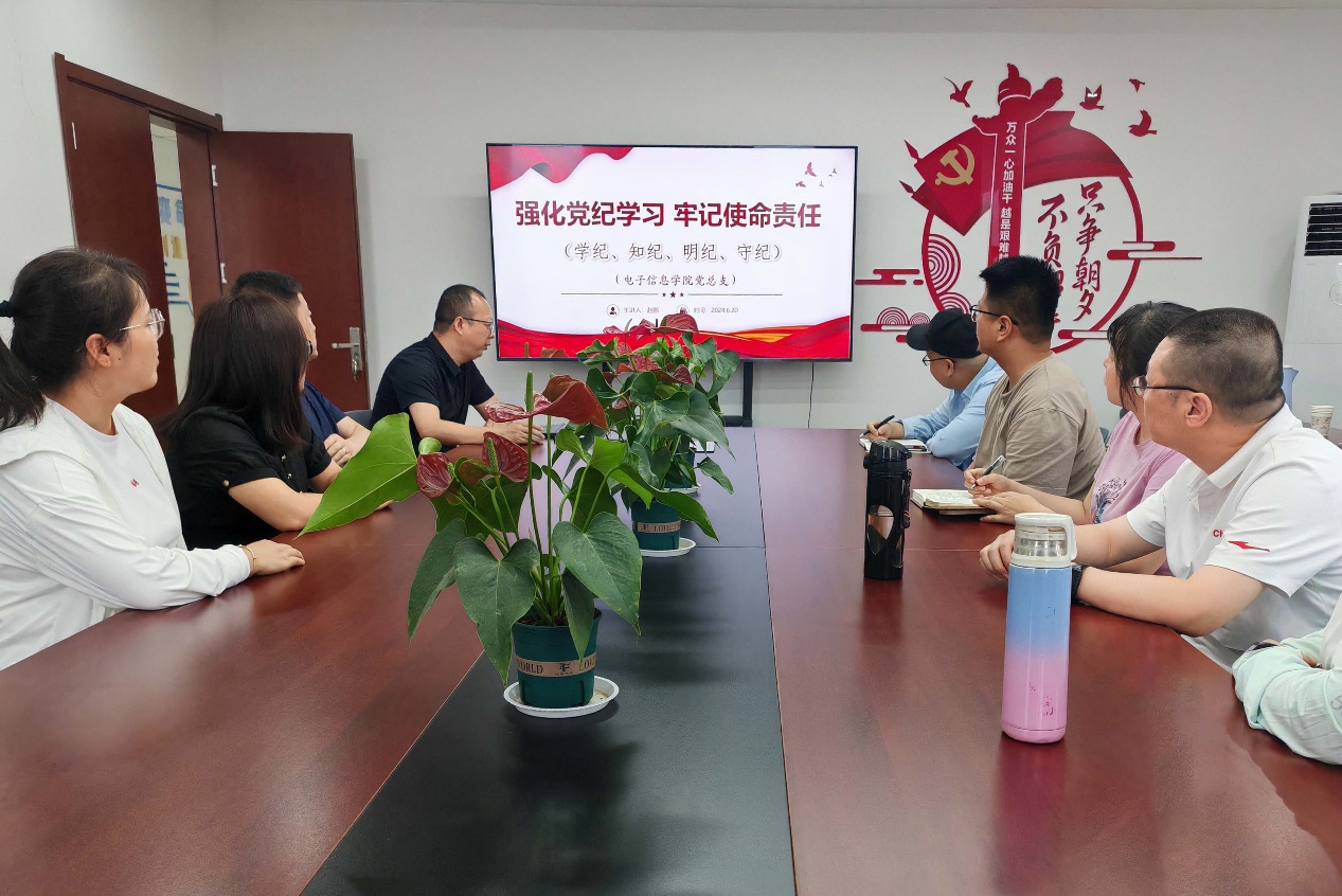 2024年6月20日下午,电子信息学院党总支在602会议室举行了一场题为“强化党纪学习,牢记使命责任”的党纪学习教育主题党课,主讲人为电子信息学院党总支书记赵鹏,电子信息学院全体党员参加了此次学习活动。