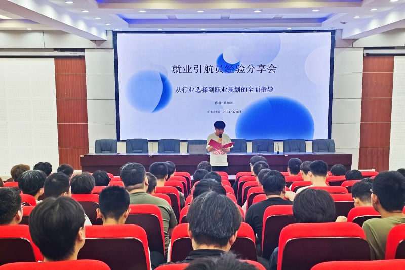 为推进“大学生就业引航计划”,落实“进支部、抓宣讲、送服务、树典型”系列活动,引导大学生立足实际、找准定位,树立理性平实的择业观、就业观、劳动观。2024年7月3日晚上7点,人工智能学院团总支在教学二号楼报告厅组织开展“大学生就业引航员”系列宣讲会——名企学生就业引航员返校园活动。本次活动邀请了人工智能学院2024届电气自动化技术专业优秀毕业生孔德凯重返母校,作为就业引航员为学弟学妹们带来宝贵的职场经验和就业经验分享。2025届辅导员老师以及大二在校生代表共200余人参会。
