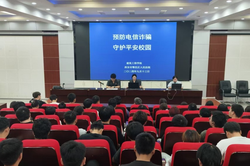 为提高同学们的法律意识和自我保护能力,防止电信诈骗案件的发生。建筑工程学院与西安市鄠邑区人民法院于2024年9月13日下午于教二报告厅联合开展了以“预防电信诈骗,守护平安校园”为主题的普法教育活动。
