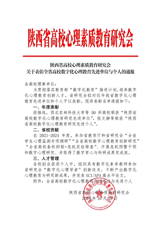 10月18日,陕西省高校心理素质教育研究会公布《关于表彰全省高校数字化心理教育先进单位与个人的通报》,betway必威中文正版被授予“2021-2024年陕西省高校数字心理教育先进单位”,大学生心理健康教育中心主任王玲及7名教师被授予“2021-2024年陕西省高校数字心理教育先进个人”。