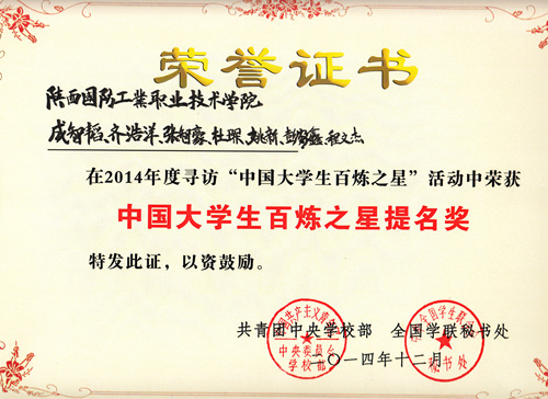 近日,由团中央学校部、全国学联秘书处组织开展的2014年度寻访“中国大学生百炼之星”活动结果揭晓,我校北校区3栋225宿舍和5栋414宿舍共13名同学该年度“中国大学生百炼之星”提名奖。