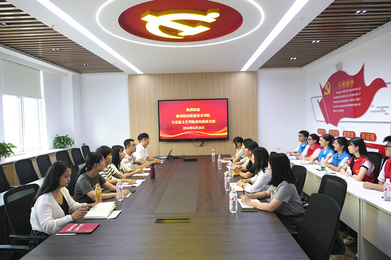 为进一步贯彻落实习近平总书记对学校思政课建设做出的重要指示,深化思想政治理论课教学改革与创新,6月26日下午,陕西财经职业技术学院马院师生一行13人来校进行交流座谈,马克思主义学院办公室主任皮睿、思想道德与法治教研室主任李航,习近平新时代中国特色社会主义思想概论教研室主任张贺以及思政课教师代表王晶、张鑫和王琳参加了会议。