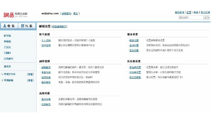 点击“设置”,进入邮箱设置页面。可以对邮箱进行设置,包括个人资料、修改密码等。如图所示: