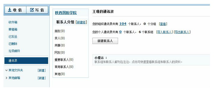 点击“通讯录”,进入通讯录页面。可以通过通讯录查询联系人信息及通过联系人地址给其发邮件。可通过“新建联系人”按钮添加新的联系人信息。