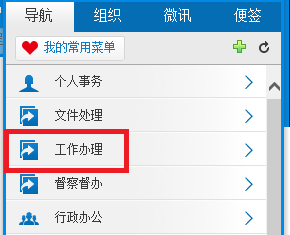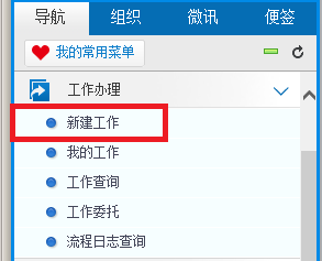 2、在“导航”选项卡中,点击“工作办理”,点击“新建工作”如图所示。