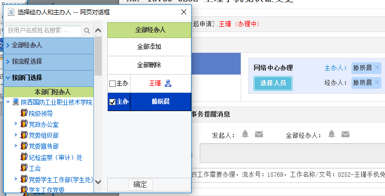 6、点击“选择人员”按钮,选择相应人员,点击确定。如图所示。