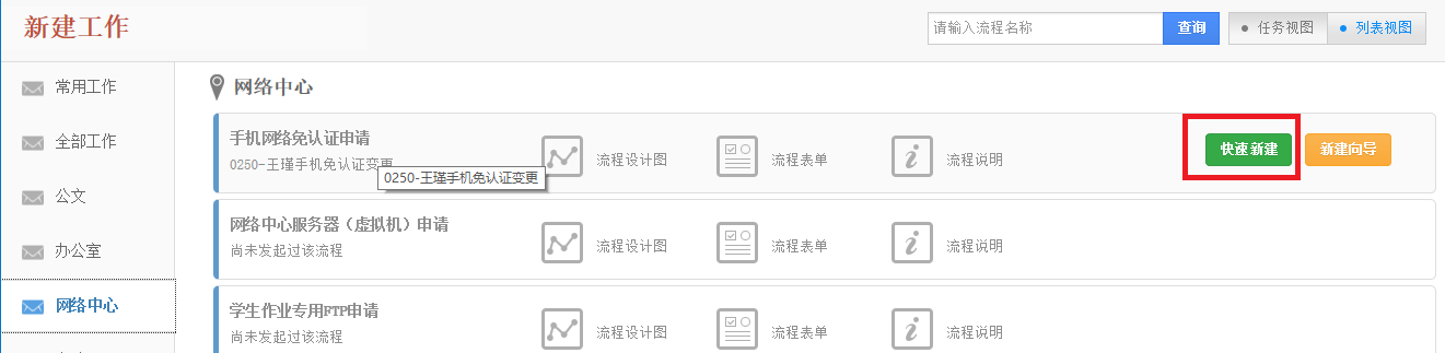 3、打开“新建工作”对话框。在“网络中心”选项卡中选择“手机网络免认证申请”点击“快速新建”按钮。如图所示。