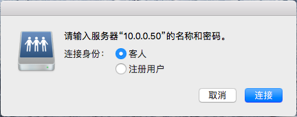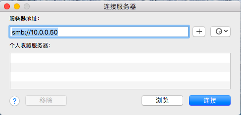 2、在“连接服务器”的“服务器地址”中填入“smb://10.0.0.50”,点“连接”,