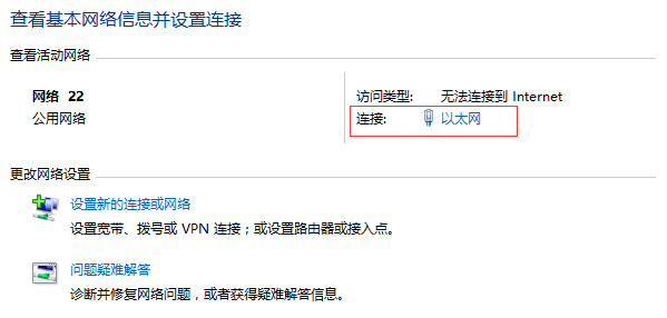 ,选择打开网络和共享中心,在弹出的对话框中找到并点击以太网,如下图所示: