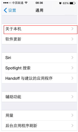 在通用主菜单中,找到并点击关于本机,如下图所示: