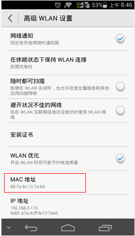 在Wi-Fi页面中显示的Wi-Fi地址即表示当前设备的MAC地址。如下图所示: