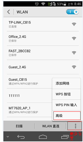 点开WLAN后,在右下角点击更多设置,在出现的菜单选项中点击高级,如下图所示: