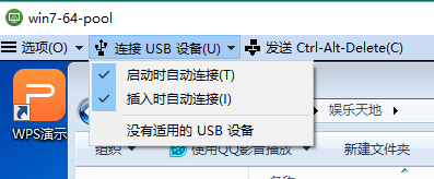 进入桌面后,在最上面有功能菜单,选择“连接USB设备”,选中“启动时自动连接”和“插入式自动连接”,可以在云主机中使用物理机的U盘和其他USB设备。