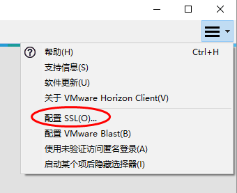 2、打开“VMware Horizon Client”,点击右上角“下拉列表”,选择“配置SSL”,在配置界面,选择“不验证服务器身份证书”,点“确定”