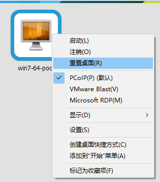 在可用云主机按右键,可以选择重置桌面(相当于重装系统),可选择不同的桌面协议,默认PCOIP,在外网的用户,请选择“Vmware Blast”协议,否则可能进去黑屏。
