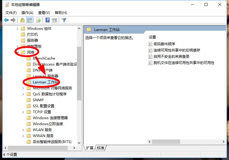5、在“管理模板”中找到“网络”并在“网络”中找到“Lanman工作站”如下图