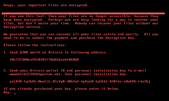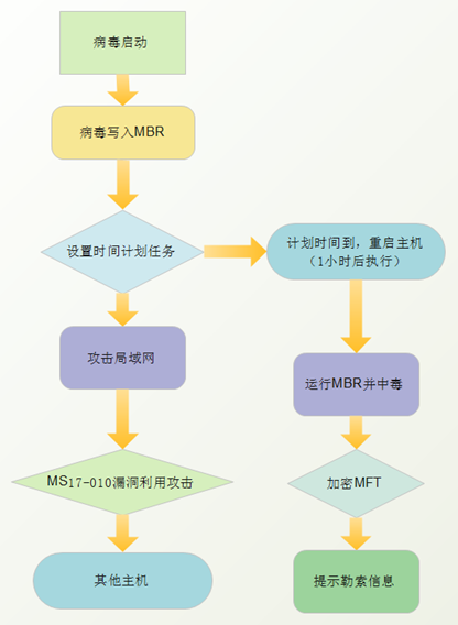此次攻击者采用早前Petya勒索病毒的变种,其传播方式和WannaCry类似,但该病毒除了使用永恒之蓝(MS17-010)漏洞之外,还罕见使用了黑客的横向渗透攻击技术。在勒索方面与WannaCry等不同之处在于,Petya木马主要通过加密硬盘驱动器主文件表(MFT),致使主引导记录(MBR)不可操作,通过占用物理磁盘上的文件名、大小和位置的信息来限制对完整系统的访问,从而让电脑无法正常启动,故而其影响更加严重。如果想要恢复,需要支付价值相当于300美元的比特币。